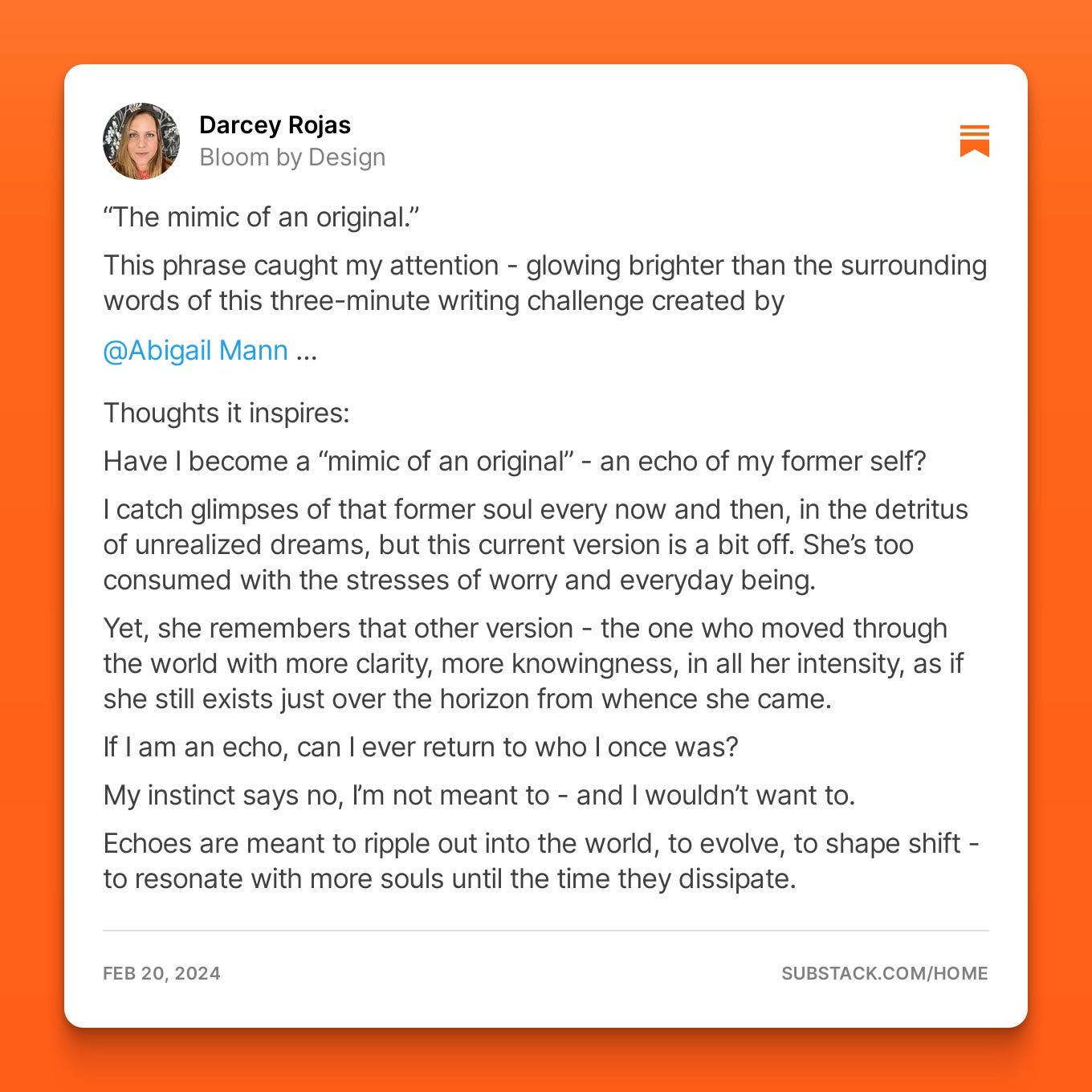 If you’re curious, here is my response to Abigail Mann’s Three-minute writing prompt: Echoes…